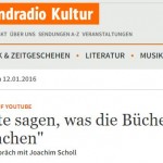 Der Journalist und Literaturkritiker Stefan Mesch wurde vom Deutschlandradio Kultur zum Thema „Booktube“ befragt. Mit einem Klick auf diesen Screenshot könnt ihr dem Gespräch lauschen: