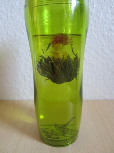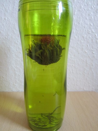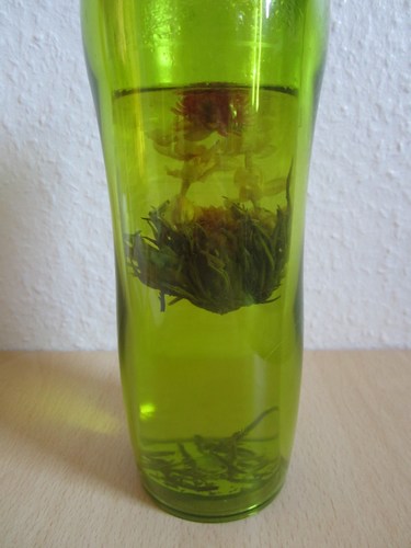 Also packte ich die Teerose „Blumenkorb der Göttin“ in das Gefäß. Die Zutaten dieser Rose sind: Grüner Tee, Jasminblüten, Blüte des Langen Lebens
