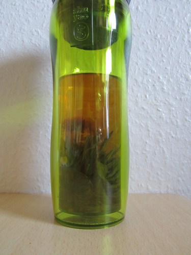 Nach ein paar Schlücken hab ich dann nochmal ein Foto gemacht. Man sieht, dass sich das Wasser verdunkelt hat. Die Rose hat sich entfaltet (kann man wegen des verdunkelten Wassers jetzt leider nicht sooooo gut sehen). Was sie aber natürlich in einer richtigen (breiten) Glaskanne noch schöner gemacht hätte.