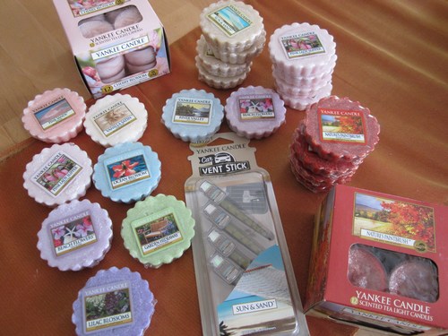 Wie ihr seht, hab ich von einigen Düften mehrere Tarts bzw. Teelichte bestellt. Das sind meine aktuellen Favoriten (Sun & Sand, Cherry Blossom, Natures Paintbrush, Pink Lady Slipper, und davon kann ich nicht genug im Haus haben. Die Teelichte pack ich mir immer passend zu den Tarts in dieses Teil im Flur: