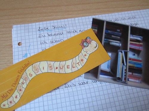 Vor ein paar Tagen trudelte Post von der lieben Viktoria bei mir ein. Leider weiß ich nicht, wie alt sie ist. Anhand ihrer Schrift in dem wunderschönen Brief schätze ich sie aber so auf 12/13/14 Jahre. Sie hat mir ein total schönes Lesezeichen gebastelt und ein kleines Foto ihres Bücherregals geschickt. Ich liebe es, wenn ich sowas bei Kindern bewirken kann. Vielen lieben Dank dafür!! (Habe natürlich auch zurückgeschrieben!) 😉