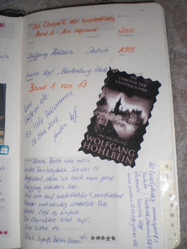 Und zum Schluss kommt hier noch ihr Eintrag ins Mole. Ihr Lieblingsbuch ist Am Abgrund von Wolfgang Hohlbein: