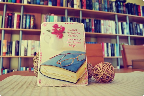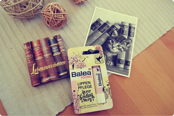 Ebenfalls anlässlich des „Welttag des Buches“ erreichte mich ein Päckchen von Luchessa, die sehr schmunzeln musste, als sie mein Video zu dem Tag sah. Denn in dem Buch befinden sich tolle Zitate von berühmten Menschen, die allesamt mit Büchern zu tun haben. Es schaut klasse aus, oder? Und dann der Lippenpflegestift! Von Balea YOUNG! YOOOOUUUUNG!! 😉 Ebenfalls wunderschön und liebenswert: Die Postkarte. Katze und Buch … reicht für’s Glücklichsein, oder?