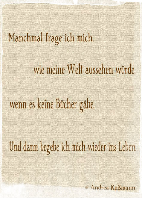 Ein ganz toller Spruch!! Aber ich mag mir gar nicht vorstellen, wie die Welt ohne Bücher wäre, denn für mich wäre sie dann garantiert nicht schön!