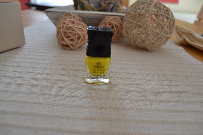 Als erstes fiel mir der Nagellack von Alessandro ins Auge. Wahrscheinlich wegen der echt knalligen Farbe. Er ist aus der „We love colours“-Edition und nennt sich (passender Weise) „Sunshine Reggae“. Was ihr jetzt hier noch nicht wisst (aber meine Facebookfreunde schon) ist die Tatsache, dass ich mir erst letzte Woche einen gelben Neonlack von China Glaze gekauft habe. Hätte ich DAS vorher gewusst, hätte ich auf die Glossybox gewartet! 🙂 Ich kann euch diesen gelben Lack jetzt gerade leider nicht swatchen, da meine Nägel aktuell pink sind, aber ein Test auf einem Blatt Papier ergab, dass er sehr schön zitronig gelb und auch sehr deckend ist. I like!
