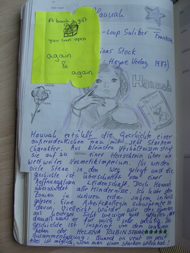 Mittlerweile hat das Moleskine Book Journal die nächste Empfängerin erreicht. Elke hat mir soooo viele tolle Fotos geschickt! Ihr Lieblingsbuch ist Hannah von Paul-Loup Sulitzer. Die Zeichnung sind soooo toll geworden! Schaut mal: