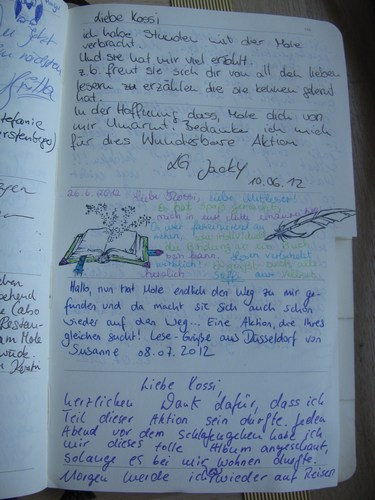 Die Moleskine-Aktion läuft ja nun schon fast genau zwei Jahre und es gibt viele viele Leser, die sich damals direkt am Anfang “beworben” haben. Da es deshalb in den letzten Monaten häufig passiert ist, dass Mole eine “Ehrenrunde” drehen musste, weil der nächste Empfänger bereits umgezogen war oder ähnliches, werde ich nun immer den nächsten Empfänger VOR dem Versenden von Mole anschreiben und nachfragen, ob die Adresse noch stimmt und ob derjenige überhaupt Zeit hat, Mole in den nächsten Tagen auszufüllen. So geht zwar der Überraschungseffekt verloren, aber anders scheint es mir leider nicht möglich zu sein.