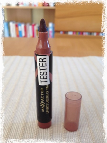 Ich konnte mein Glück kaum fassen, als ich dann sah, dass noch viel mehr in der Box war! Zum Vorschein kam nämlich auch noch diese Lipfinity Lip Tint von Max Factor in der Farbnuance „10, Latte“. Ich LIEBE ja so Rotbrauntöne (vor allem im Herbst/Winter) und bin soooo gespannt, wie das funktioniert. Ich werde sicher das Gefühl haben, mir mit einem Edding die Lippen anzumalen hihi. Getestet habe ich ihn noch nicht, da ich gerade keinen farblich passenden Lipliner habe, aber der Duft ist schon mal Hammer. Irgendwie fruchtig und süß. Laut Packungsbeilage soll er auf den Lippen kussecht und matt sein. Gefällt mir! 😉 Auch hier handelt es sich um eine Originalgröße zu einem Ladenpreis von 9,99 Euro! Der „Tester“-Aufkleber hatte mich zunächst irritiert, aber auf der Facebook-Seite hatte eine Mitarbeiterin folgendes dazu geschrieben: „Liebe Damen, ich wurde soeben informiert, dass es sich um neue Ware – selbstverständlich – handelt und die Sticker tatsächlich nur für die zur Verfügung gestellten Produkte sind und aus keinem Laden in dem Sinne stammen.“