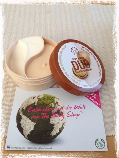 Ganz unten in der Box erwartete mich dann ein weiteres Highlight aus dem Hause „The Body Shop“! Es handelt sich hier um eine Originalgröße von 200 ml für den Preis von 15,00 Euro! Ist das nicht der Hammer? Es ist eine Körpercreme, die aus zwei verschiedenen Wirkstoffen besteht. Die helle Creme ist für normale Haut und eher dickflüssig wie eine Bodylotion. Die dunkle ist für trockene Haut und eher fest wie Butter halt. Das finde ich klasse, denn an meinem Körper befinden sich normale UND trockene Hautstellen! Der absolute Kracher ist aber der DUFT!! Ich habe mir gerade meine Unterarme damit eingecremt und bin richtig verliebt in mich selber ♥ Drauf steht was von „Macadamia“ und ich möchte die Creme am liebsten essen wie einen Joghurt! Das ist der Hammer!! Abgerundet wurde das Ganze dann noch mit einem 20%-Gutschein für den Body Shop und alles in allem ließ mich die Box mit einem echt zufriedenen Lächeln zurück:
