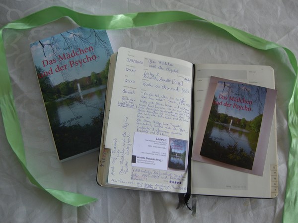 Die aktuelle Empfängerin des Moleskine Book Journal ist Annette. Sie hat in diesem Fall ihr selbst geschriebenes Buch als Lieblingsbuch eingetragen. Es handelt sich um „Das Mädchen und der Psycho“ und so schaut es aus: