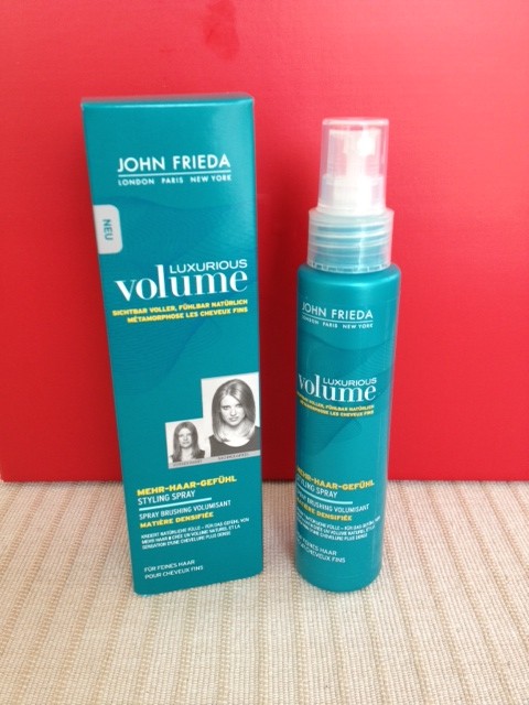 Das zweite Produkt klingt schon eher kossilistisch. Zumindest werde ich es mal testen. Es handelt sich um das Luxurious Volume Styling Spray von John Frieda, für das die Leute ohne die DM-Box im Laden 5,95 Euro hinlegen müssen: