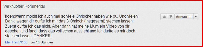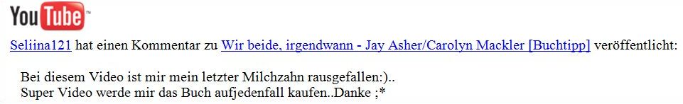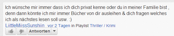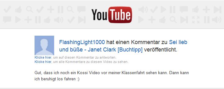 Gestern Abend zum Beispiel. Da bekam ich mal wieder einen total süßen Kommentar bei Youtube, machte einen Screenshot und postete ihn … na? Wo? Genau! Bei Facebook! Und heute morgen kam mir dann die Idee, meine „gesammelten Youtubekommentarwerke“ doch auch mal hier zu posten. Es sind nur sieben, weil das alle sind, die ich derzeit noch gespeichert habe. Aber vielleicht kommen ja ab und zu ein paar neue dazu und die werde ich dann auch hier posten. Ich freue mich natürlich über ALL eure Kommentare, aber bei manchen bleibe ich halt hängen und amüsiere mich sehr drüber 😉