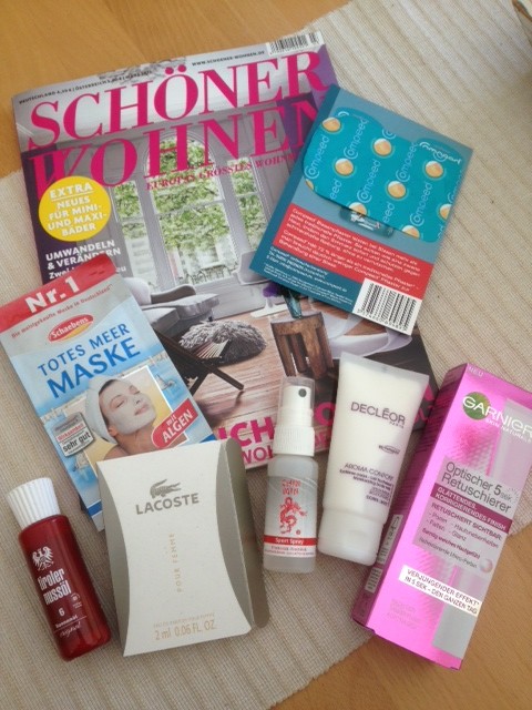 Lacoste Parfümprobe (gefällt mir SEHR!) Aber wohl auch eher deshalb, weil ich davon eine Flasche in meinem Bad stehen habe! Der Duft ist doch schon uralt. Ich hätte mich über eine NEUE Parfümsorte mehr gefreut.