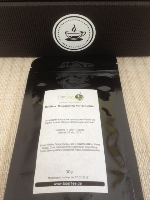 Fangen wir mal an mit Rooibos Rosengarten Morgenschön. Klingt interessant und ich war gespannt, wie er schmeckt! Ich mag Mango und Früchte dieser Art ja mal so gaaaar nicht nicht so sehr und bin deshalb SEHR gespannt, wie dominierend genau dieser Mango-Geschmack hier sein wird. Da er bei der Auflistung ja nicht an erster Stelle steht, bin ich noch guter Hoffnung 😉