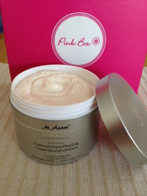Und jetzt kommt der Hammer! Und ich habe dufttechnisch sogar auch noch Glück gehabt, denn dieses M. Asam Körperpeeling hätte es auch noch in der Variante Mandarine-Zimt gegeben und ich weiß, dass ich das nicht gemocht hätte. Ich habe die 300-ml-VinoLift-Variante mit feinem Cherry Powder und Shea Butter und ich habe es mir gerade einfach mal auf den Handrücken geschmiert. Es riecht total angenehm. Beim nächsten Duschbad wird gepeelt! 😉 Der ganze Spaß kostet 23,50 Euro (!!!!)