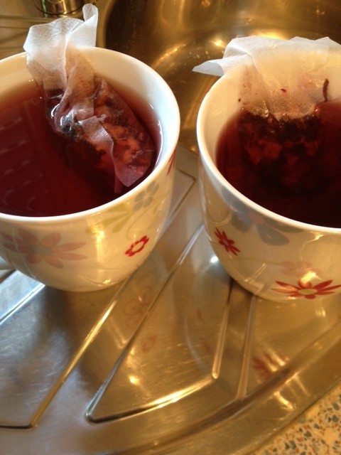 Zunächst habe ich die komplette Probe in zwei großen Tassen (insgesamt ca. 800 ml) aufgebrüht. Wenn ich größere Filter zuhause gehabt hätte, hätte ich den Tee ganz normal in einer Kanne aufgebrüht, aber es passte nicht alles in meine Filter hinein 😉 Eigentlich würde ich für diese Menge an Wasser höchstens die Hälfte der Probe benutzen, aber man soll immer doppelt so viel Tee nehmen, wie man ihn halt sonst so nimmt. Wenn du für eine Tasse Tee also normalerweise 2 Teel. nimmst, so musst du für den Eistee 4 Teel. in den Beutel packen.
