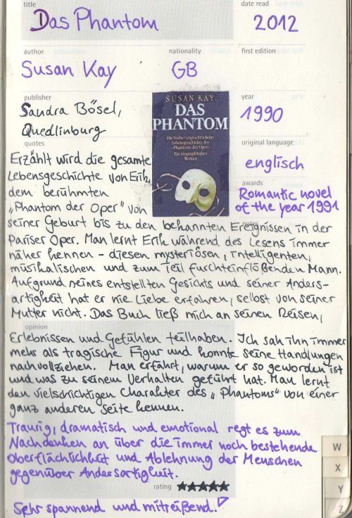 Zum Glück hat Mole es aber überlebt und so konnte Sandra ihr Lieblingsbuch „Das Phantom“ von Susan Kay dort eintragen 😉