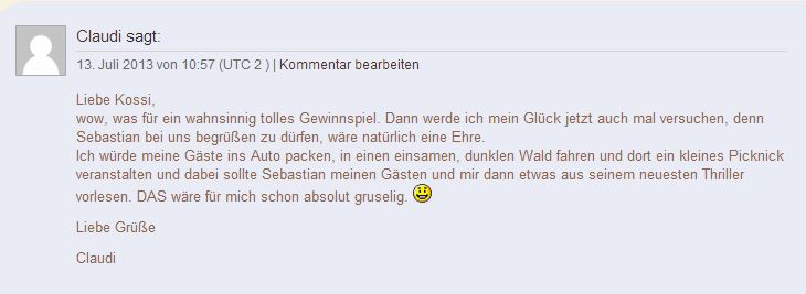 Naja, ob es wirklich eine kleine Lesung in einem Wald geben wird, das hängt natürlich von vielen Faktoren ab. Jahreszeit, Wetterverhältnisse usw. Auf jeden Fall kann ich schon mal so viel sagen, dass Sebastian nach NRW reisen muss, genauer gesagt in die Nähe von Köln. 😉 Mal schauen, wie es genau ablaufen wird. Lassen wir uns überraschen.