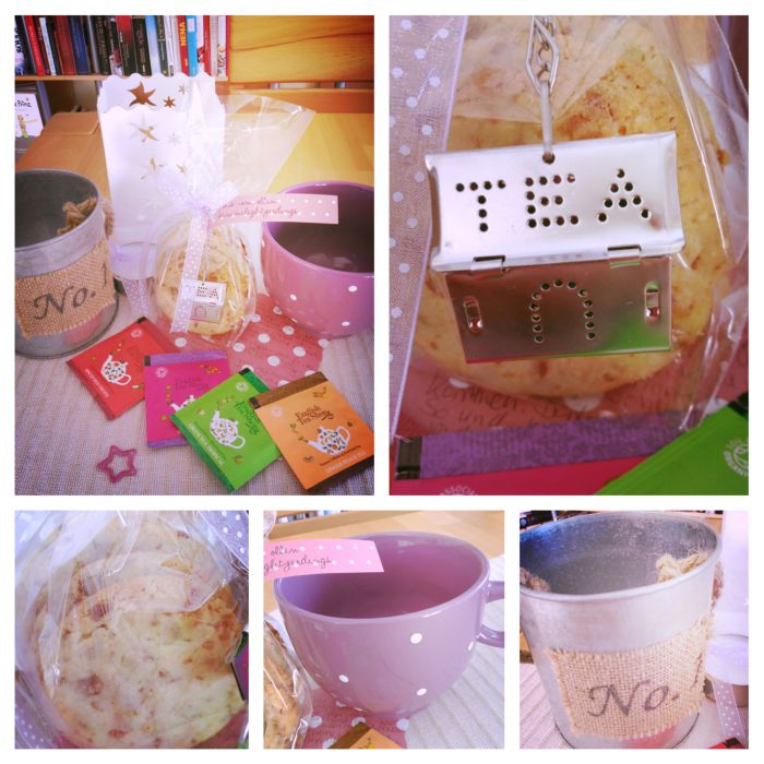 Unten links findet ihr selbstgebackene Kekse. Der Name Anita „XYZ“ sagte mir auf Anhieb nichts, aber als ich den Zettel daran sah und auch in ihrem total lieben Brief schrieb sie es nochmal, dass sie „Das olle Himmelglitzerdings“ ist, wusste ich Bescheid. Leute! Folgt ihr UNBEDINGT bei Instagram und auf ihrem Blog. Den Blog schaue ich mir eigentlich nicht an (da stehen dann aber die ganzen Rezepte, die ich ja eh nicht nachbacken oder nachkochen würde, weil ich sowas von talentfrei bin, was solche Dinge angeht hehe), aber es gibt ja sicher Blogleser von mir, die nicht bei Instagram sind und deshalb die Bilder dort vielleicht nicht sehen können und vor allem, die heiß auf die Rezepte sind. Die gibt es dann eben zusätzlich in ihrem Blog. Bei Instragram läuft mir regelmäßig das Wasser im Mund zusammen, wenn ich ihre „Essensfotos“ sehe. Da komme ich mit meinem Bauernomelett oder mit meinen Nudeln mit Pflaumen nicht mit, das kann ich euch sagen. Sie macht so tolle Koch- und Backgeschichten und ich freue mich jetzt total auf die Kekse. Allerdings passen sie heute nicht mehr in meinen … ähm … Ernährungsplan … und deshalb muss ich sie mir für die nächsten Tage aufbewahren. Zur Vorsicht werde ich sie gleich mal in eine Gebäckdose packen, damit sie nicht hart werden. Ach so und jetzt hätte ich fast vergessen, zu schreiben, wo ihr Anita findet. Also hier ist ihr Instagram-Account und hier gehts zu ihrem BLOG. Witzig finde ich, dass der Hintergrund des Blogs voll zu ihrem Briefpapier und zur Riesentasse passt hihi