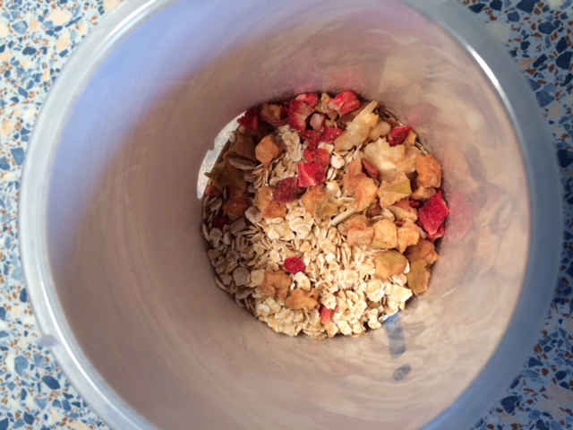 Drin sind Apfelstücke, Erdbeerstücke, weiße Schokolade, Corncrisper und natürlich Haferflocken und nackelig und unaufgeheizt sah es so aus: