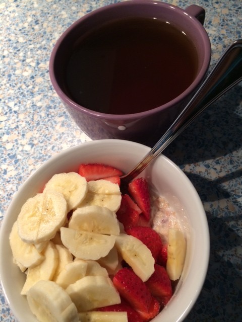 Ich habe schon als Kind gerne Haferflocken mit Milch zum Frühstück gegessen und das hat sich bis heute nicht geändert. Ich habe immer so Phasen, in denen ich morgens am liebsten warmen Haferbrei mit Obst esse. Das mach ich dann ein paar Wochen, bis es mir zum Hals raushängt, dann pausiere ich wieder und dann fange ich wieder damit an.