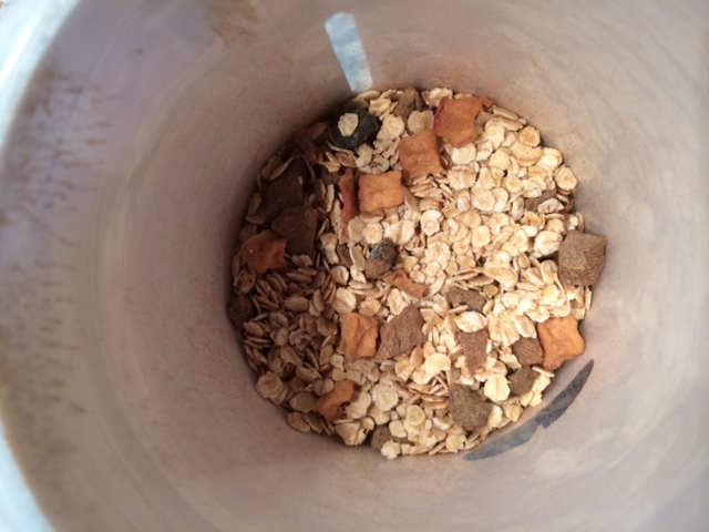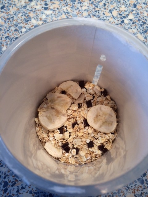 Und Leute, was soll ich sagen? Eigentlich könnte ich heute schon mit dem Testen aufhören! Warum? Nun … ich glaube, dieses Foto sagt schon mal ein wenig drüber aus. Man sieht Schokoladenstücke und Bananen und Haferflocken. Und alles liebe ich. Und so schaut es trocken aus: