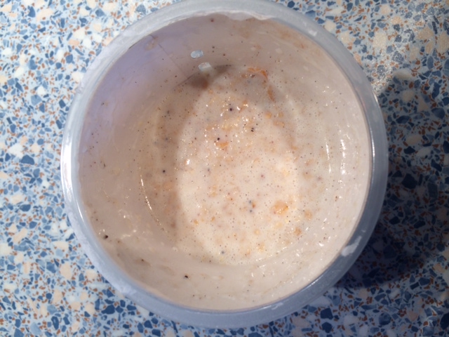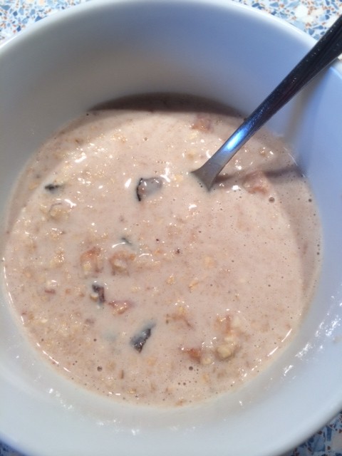 So, und dann kam der „schwierigste“ Teil für Kossi hihi. Das Ding kommt in die Mikrowelle. Da meine Mikrowelle schon uralt ist und ich leider gar nicht weiß, wieviel Watt sie so kann, weiß ich nie, ob ich die Wattzahl richtig eingestellt habe. Auf jeden Fall soll das Porridge mit 800 Watt erhitzt werden. Zunächst eine Minute, dann nimmt man den Pott raus, rührt um, packt ihn nochmal eine Minute in die Mikrowelle, dann nochmal umrühren und dann nochmal 20 Sekunden und dann schaut es so aus: