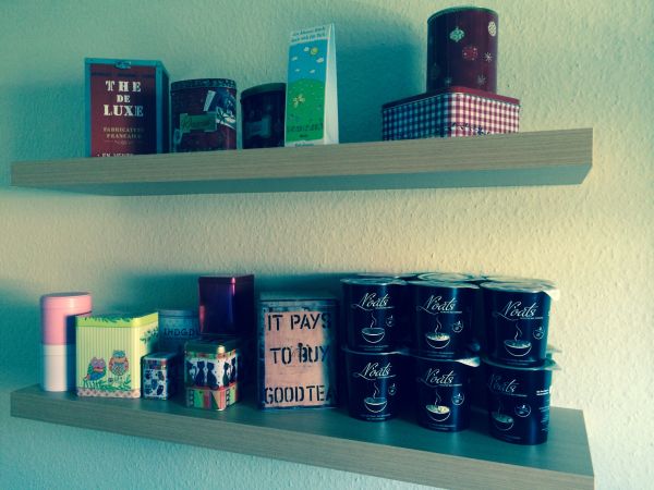 Die 12 Becher nehmen natürlich ordentlich Platz weg, aber zum Glück habe ich mir letzte Woche ein neues Teeregal an die Wand geklöppelt, auf dem noch jede Menge Platz ist und deshalb hab ich die Becher erstmal dort gestapelt: