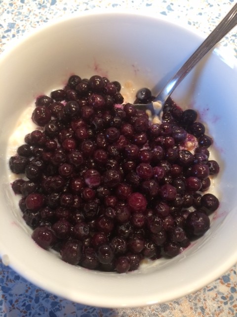 Um die Rosinen nicht sehen zu müssen (und ich schmeckte sie dann auch nicht mehr doll raus und das, was ich rausschmeckte fand ich dann erstauntlicher Weise sehr angenehm), schüttete ich dann ne ganze Ladung TK-Heidelbeeren drauf und DAS war dann erst recht ein TRAUM! Hätte ich NIE im Leben gedacht! Schaut mal: