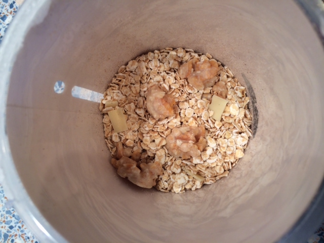 Ach so, was vielleicht noch wichtig ist: ich musste gestern keinen Apfel zwischen Frühstück und Mittagessen essen, weil ich noch sehr gesättigt war. Sollte man nicht meinen, oder? Es sind ja immer nur 40 g Porridge in dem Becher, aber die sind dann sehr gehaltvoll.