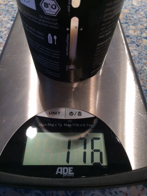 Ich hab den Pott mal auf die Waage gestellt, um zu sehen, wie viel Milch bis zur Markierung reingeht. Man hätte sicher auch noch ein wenig mehr reinschütten können bis zur oberen Toleranzgrenze, aber ich wollte erstmal schauen, wie es schmeckt, wenn ich alles ganz genau nach Anleitung mache.
