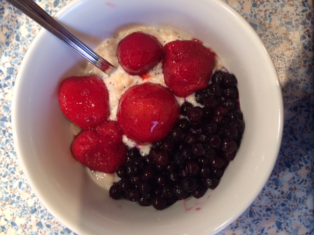 Da mir Porridge aber so immer zu wenig vitaminreich ist, kamen heute Erd- und Heidelbeeren drüber. Leider hatte ich keine frischen im Haus, aber die TKs tun’s auch. Die sind übrigens von Bofrost, falls es jemanden interessiert: