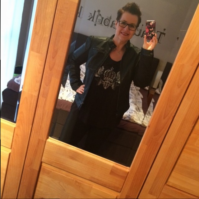 Und hier das Bikerjackentragefoto 😀 (Das Shirt ist von „Glööckler“)