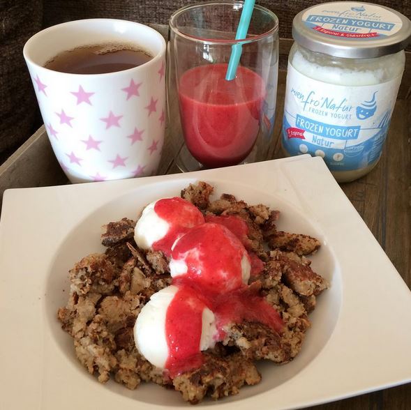 Ich sag’s euch: es ist geil 😂 Ich habe Pancakes zu sowas wie Kaiserschmarren zerrupft. Der Pancaketeig besteht aus 45 g Haferflocken, 80 ml fettarmer Milch, 1 Ei, 1/2 Banane, 1/2 Teel. Backpulver und etwas Xucker Light. Dann 3 Kugeln Frozen Yogurt von Mien Fronatur drupp und die Sauce besteht aus pürierten Erdbeeren und der zweiten Hälfte der Banane 💕 Den Rest der Sauce gab es als Smoothie 😄 Dazu meine über alles geliebte Birne im Marzipanmantel. Alles zusammen 9PP.
